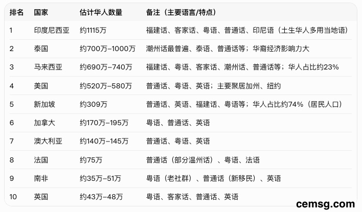 这里的华人指的是中国以外的海外华人(包括华侨、华人、华裔)。以下是2025年全球海外华人数量最多的TOP10国家:数据为估算值(因定义不同——是否包括混血后裔、自我认同、国籍等——各国差异较大,尤其是东南亚多年同化社群)。