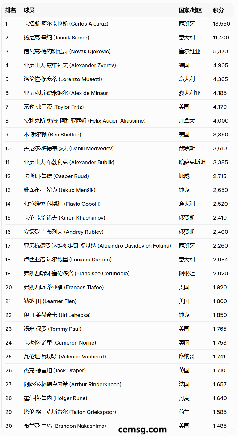 Categories 数据资讯 最新网球男单世界排名TOP30(截至2026年3月) Post date 2026-03-21 点击图片查看大图 更新于:2026年3月16日,基于ATP官网官方排名。 ← 2026世界各种语言使用人数排行TOP25
