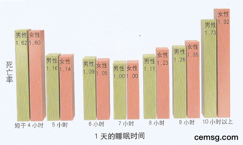 图片是一天的睡眠时间与死亡率的关系。纵轴是以7小时睡眠为参照物的死亡率相对值。该项调查是以10万名以上年龄在40~79岁的日本人为对象进行的。从图中可以看出,睡眠时间为7小时的死亡率最低。